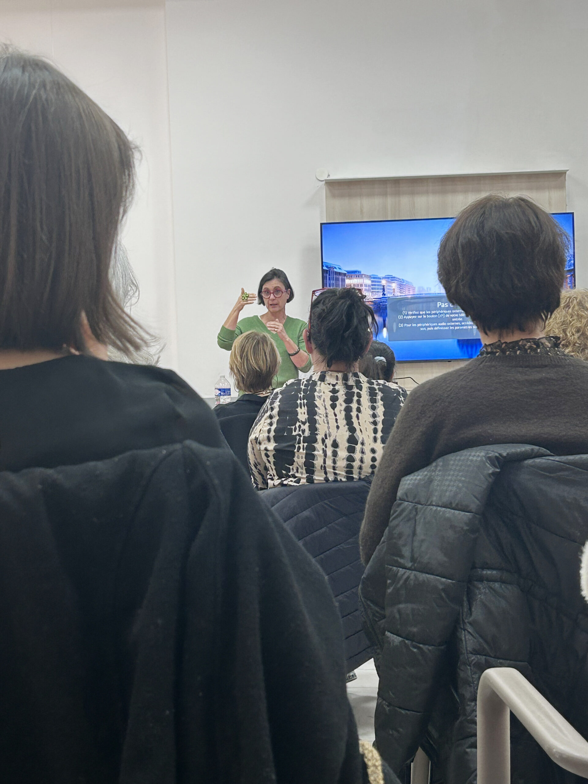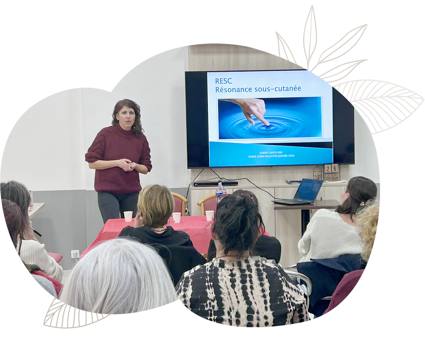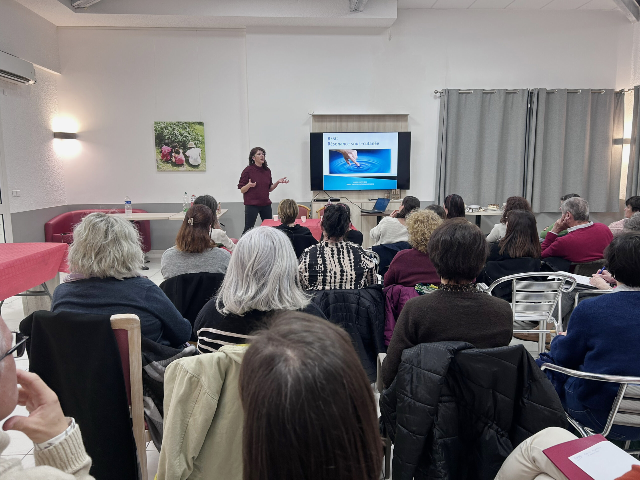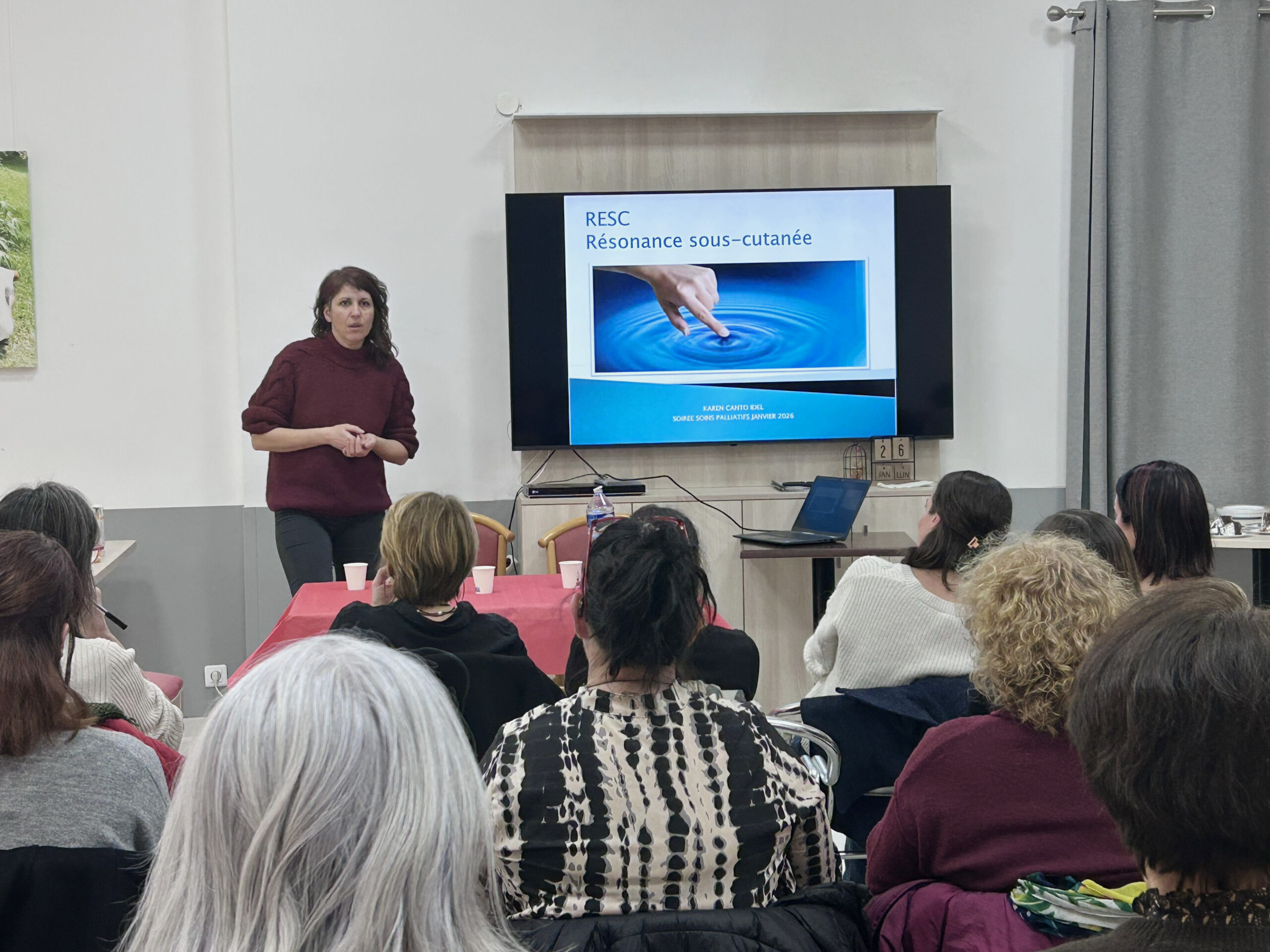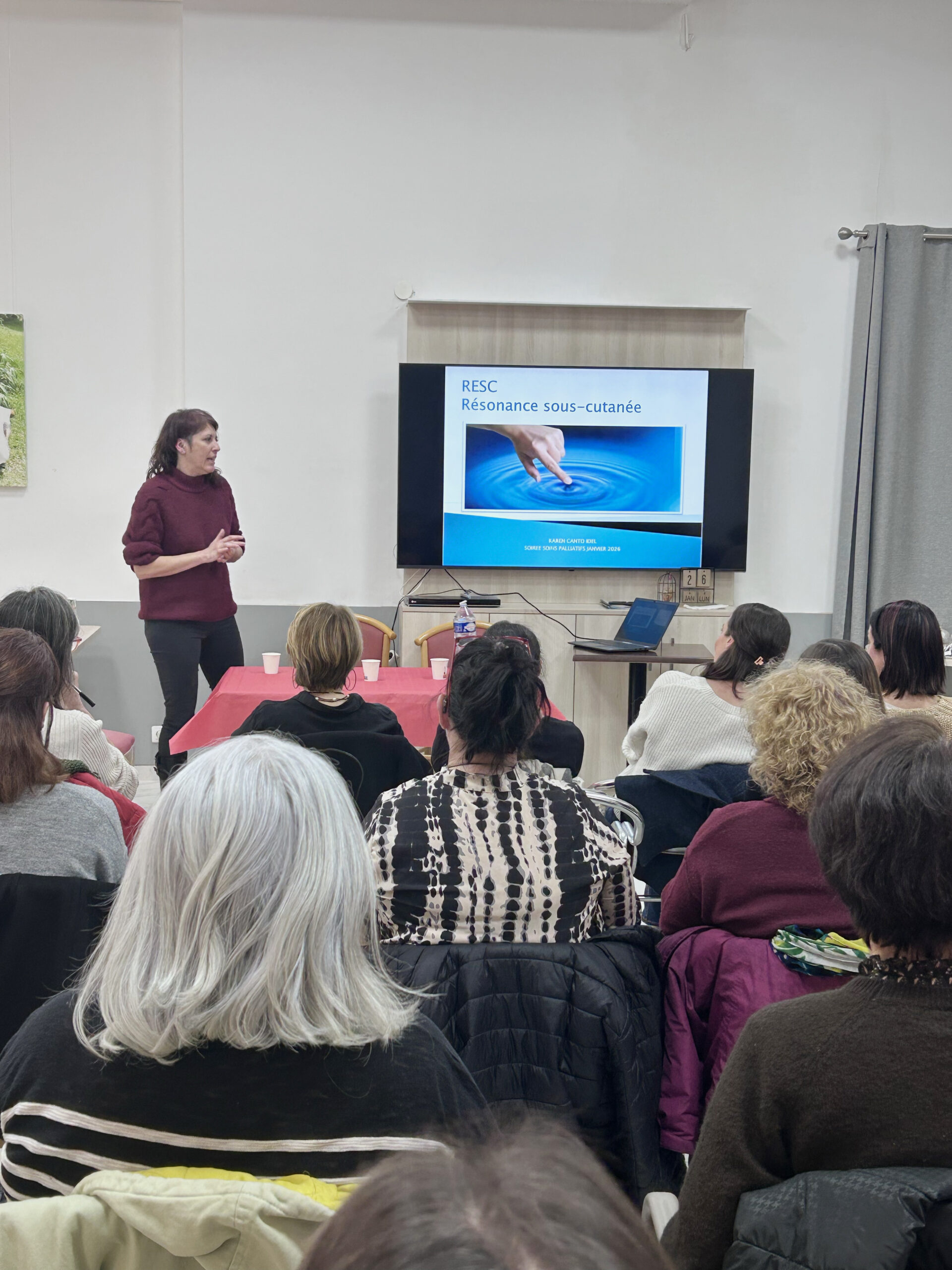 La deuxième intervention était assurée par Karen Canto, infirmière libérale, qui a présenté la RESC – Résonance Énergétique par Stimulation Cutanée, une approche non invasive, complémentaire aux soins médicaux, particulièrement adaptée aux situations de grande vulnérabilité.