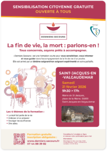 “Derniers Secours” est une sensibilisation d’une journée, gratuite et ouverte à tous, dont l’objectif est d’ informer et de guider dans l’accompagnement de la fin de vie d’un proche. Elle est animé par un binôme soignant / non soignant expérimenté en soins palliatifs.