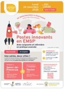 Retrouvons-nous pour échanger entre professionnels et bénévoles de votre territoire en présence des membres du CA de l’APSP autour du thème : « Postes innovants en EMSP. Une plus value au service de soins et de la transversalité. » abordée par :